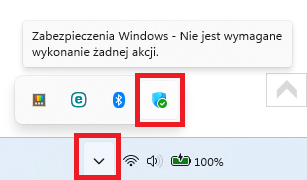 1. Proszę rozwinąć dodatkowe menu znajdujące się obok zegarka w prawym dolnym rogu ekranu i kliknąć na Zabezpieczenia Windows