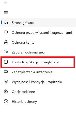 2. W nowym oknie, proszę z menu po lewej stronie wybrać Kontrola aplikacji i przeglądarki