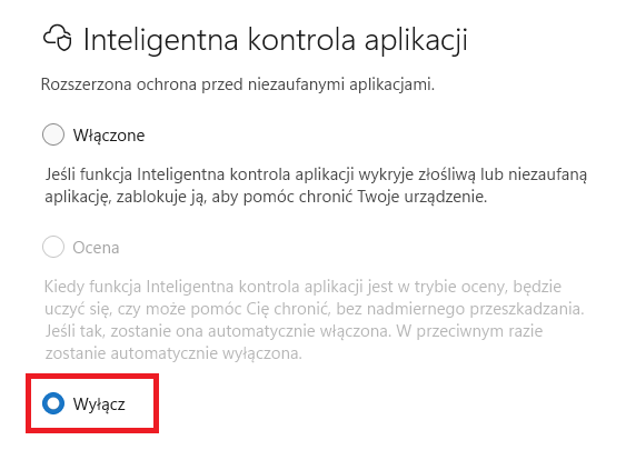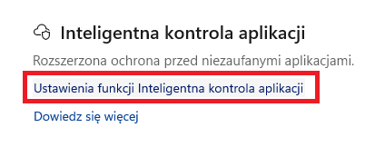 3. W nowym widoku w grupie Inteligenta kontrola aplikacji proszę wybrać Ustawienia funkcji Inteligenta kontrola aplikacji