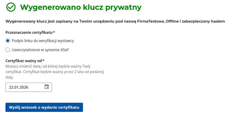 11. W kolejnym widoku zaznaczmy Podpis linku do weryfikacji wystawcy, pozostawiamy datę bez zmian i klikamy Wyślij wniosek o wydanie certyfikatu