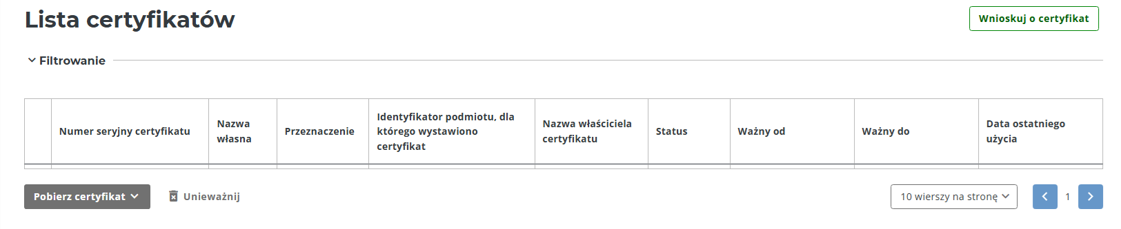 4. W kolejnym widoku wybrać z prawego górnego rogu przycisk Wnioskuj o certyfikat