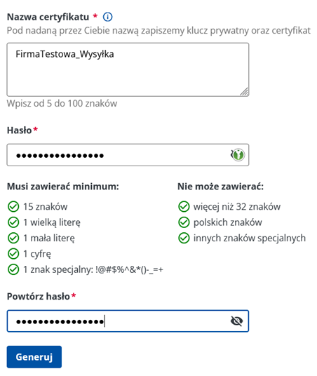 5. W kolejnym oknie wypełnić pole nazwy certyfikatu (zalecamy dopisanie do nazwy _Wysyłka) i pole hasła (bardzo ważne jest poprawne wpisanie hasła, w późniejszym czasie nie będzie możliwości jego zmiany lub podglądu)