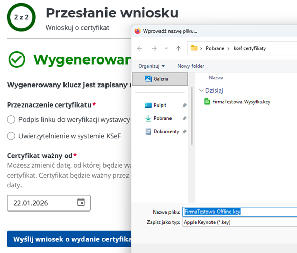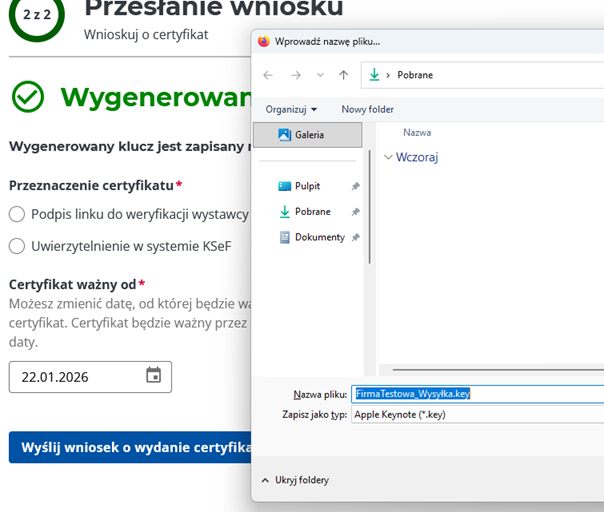 - automatyczne zapisanie pliku WprowadzonaNazwaCertyfikatu.key