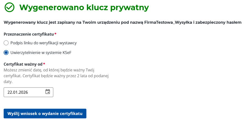 7. W kolejnym oknie zaznaczamy Uwierzytelnienie w systemie KSeF, datę pozostawiamy bez zmian i klikamy Wyślij wniosek o wydanie certyfikatu