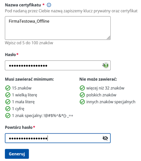 9. Ponownie wypełniamy nazwę (tym razem dopisując _Offline) i hasło (proponujemy ustawić takie samo hasło jak do poprzedniego certyfikatu, ułatwi to Państwu późniejsze uruchomienie certyfikatów w programie)