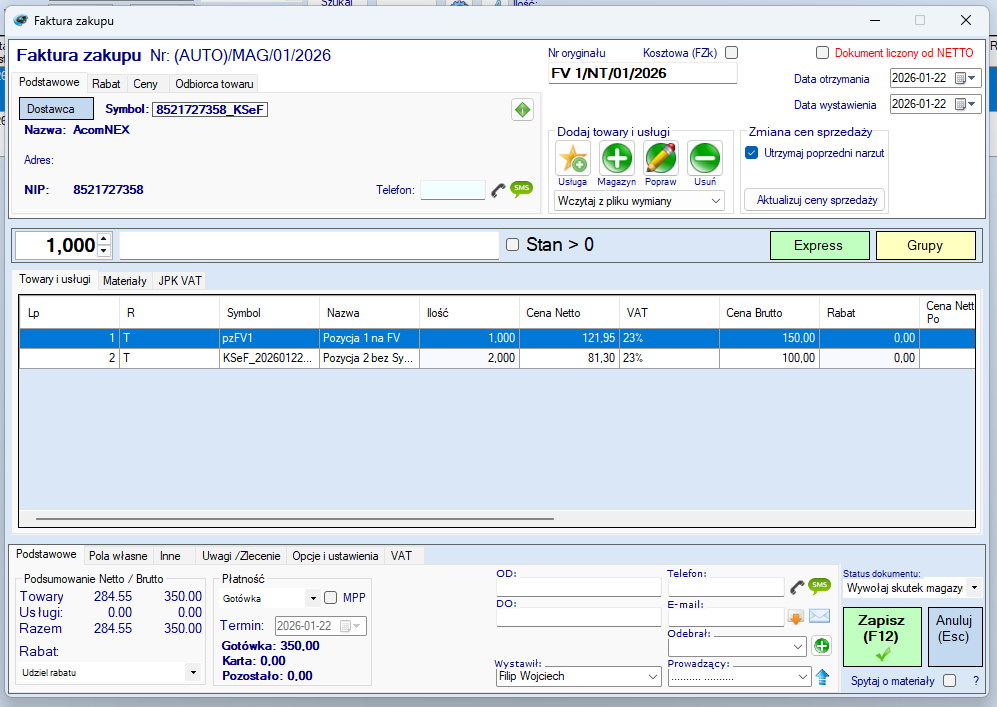 6. Po potwierdzeniu wszystkich pozycji, na oknie faktury zakupu zostaną uzupełnione wszystkie dane